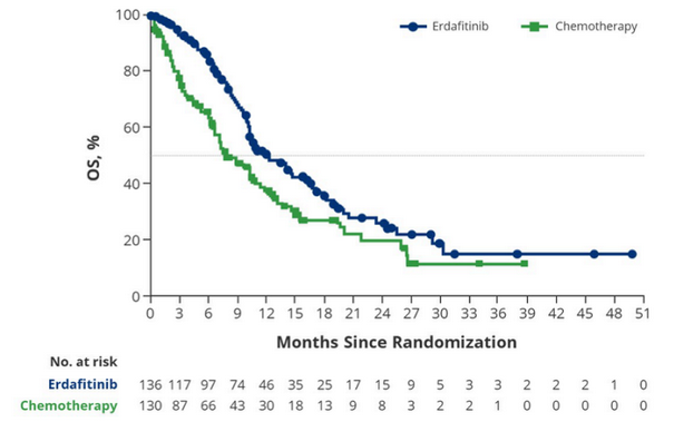 厄达替尼(Erdafitinib)在治疗携带FGFR(成纤维细胞生长因子受体)基因改变的晚期实体瘤患者,特别是尿路上皮癌患者方面,显示出一定的疗效。临床实验结果显示,厄达替尼的ORR(客观缓解率)为40%左右,这意味着大约40%的患者在接受厄达替尼治疗后,肿瘤体积有所缩小或稳定。其中,对于FGFR3基因突变的患者,ORR甚至可以达到49%。此外,厄达替尼的中位无进展生存期(mPFS)和中位总生存期(mOS)也相对较长,分别为5.5个月和13.8个月。